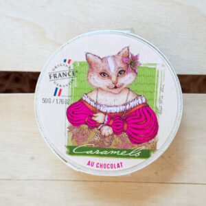 Kleine weiche Karamellbonbons mit Schokolade, die einzeln verpackt in einer charmanten Spanholzschachtel mit Katzendruck sind. Ein absolut hinreißendes Geschenk mit einem wundervollen Inhalt.