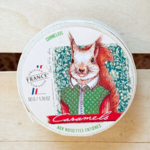 Kleine weiche Karamellbonbons mit 18 % Haselnüssen, die einzeln verpackt in einer charmanten Spanholzschachtel, die mit einem Eichhörnchen bedruckt sind. Ein absolut hinreißendes Geschenk mit einem wundervollen Inhalt.